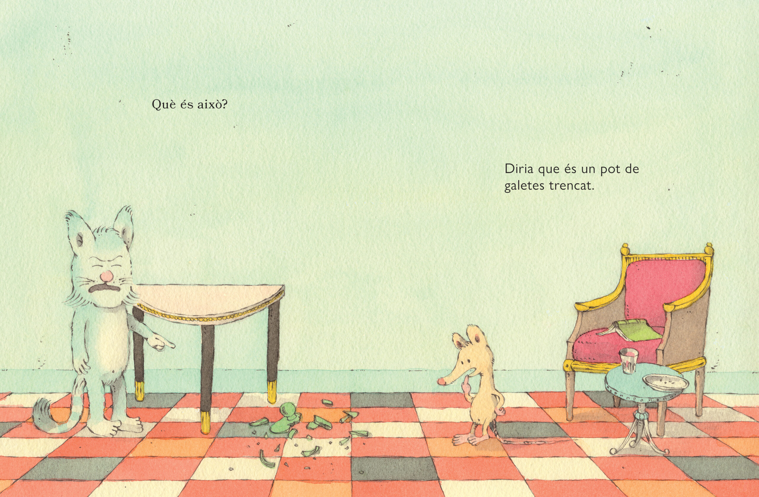 El Gat acaba d’entrar i descobreix una llauna de galetes destrossada a terra, sense cap